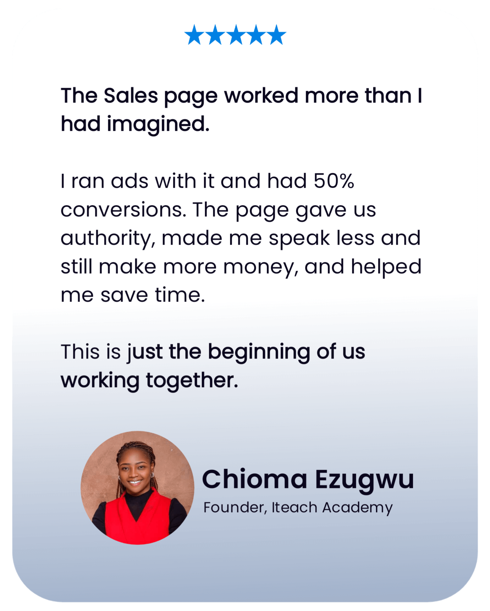 Once you provide the details for your sales page, I will block out the time, mental power and resources to craft your offer, write the copy, and create your sales page, so you can have it and everything else I have promised in just 7 days (or less.)